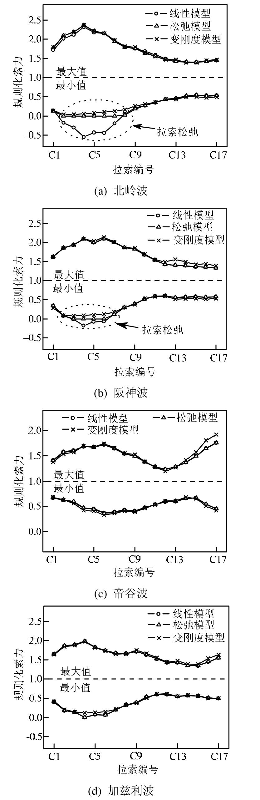 另外,从图7可知,对于出现松弛的拉索,三个模型计算得到的拉索索力最小值有较大的差别:变刚度模型索力最小值为略大于0的正值;松弛模型的索力最小值保持为 0,接近于变刚度模型的计算结果;而线性模型索力最小值小于 0,且可能出现远小于0的情况,如北岭波作用下C4索最小索力达到-0.5倍的成桥索力。由于拉索实际上是不能承受压力的,线性模型没有正确模拟拉索的力学特性。而对于未出现松弛的拉索,三个模型计算出的索力包络图相似,其中松弛模型计算结果和线性模型一致,但变刚度模型计算结果与线性模型略有差别。