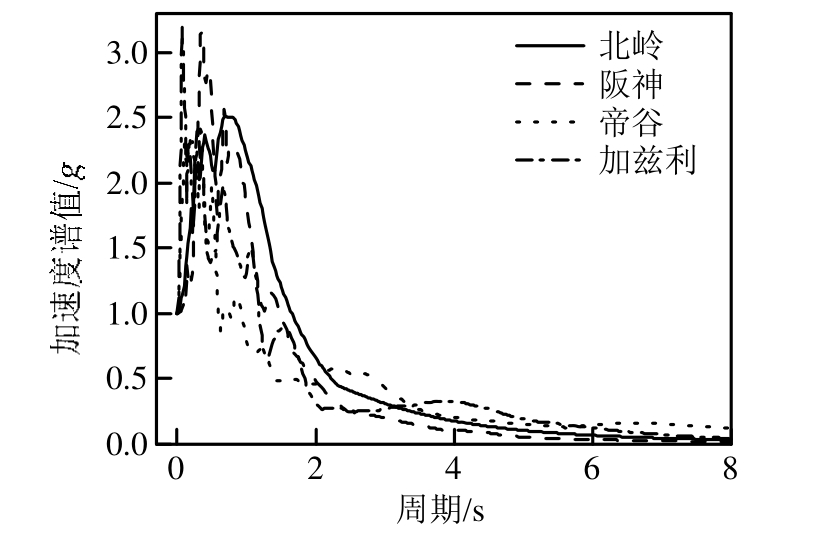 为研究强震作用下斜拉桥的地震响应,根据实际桥址场地类型,本文从太平洋地震工程中心的Ⅱ类场地地震波数据库,选择了4条地面加速度峰值较大的实测记录作为地震输入,如表4所示。其中,北岭(Northbridge)和阪神(Kobe)地震波是具有较为明显速度脉冲的近场地震动,而帝谷(Imperial Valley)和加兹利(Gazli, USSR)地震波是典型的中远场地震动。图6给出了4条地震波加速度峰值调整至1.0 g的加速度反应谱(5%阻尼比)。地震分析时,将每一条地震波的地面加速度峰值从 0.1 g逐步调整到1.0 g,对背景工程进行非线性时程分析。