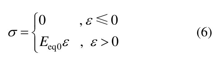 在采用式(3)定义拉索应力-应变关系时,当拉索应力变化幅度较大时,拉索将出现负应力。但实际上,拉索不能承担压力,当拉索应力降为0时,拉索将出现松弛现象。拉索松弛产生的机理是:在成桥状态,拉索都有预拉力(成桥索力);地震作用下,拉索可能产生动压力或动拉力;当地震作用产生的拉索动压力小于拉索成桥索力时,拉索可以承受动压力;当地震动压力大于拉索成桥索力,拉索将产生松弛,不能继续承受动压力。考虑拉索松弛效应,拉索应力-应变关系为: