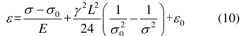 定义拉索的等效应变(以下简称为应变)为ε=δ/Le ,式中δ为拉索伸长量,Le为拉索无应力长度。由式(1)可得拉索线性应力-应变关系: