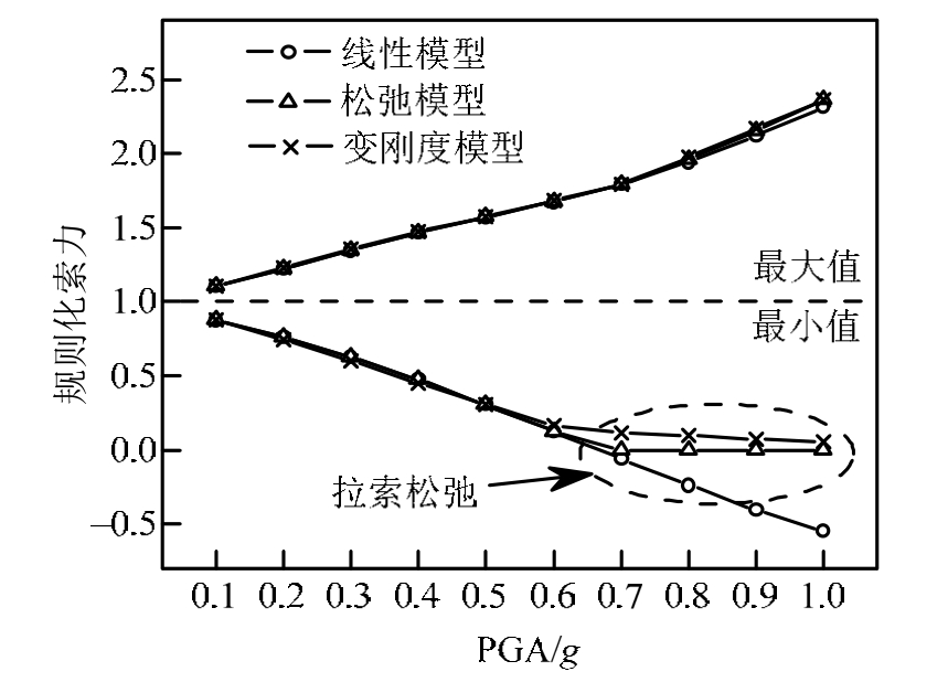 以北岭波为例,图8给出了C4索规则化索力随PGA的变化关系。从图8可知,C4索在PGA≥0.7 g时拉索将出现松弛现象。在拉索松弛前(PGA<0.7 g),三个模型计算得到的拉索索力最小值基本相同。拉索松弛后(PGA>0.7 g),三个模型计算得到的最小索力差别较大,如PGA=1.0 g时,线性模型和松弛模型分别较变刚度模型相差 0.60倍和0.06倍的成桥索力。另一方面,在拉索松弛前和松弛后,三个模型计算得到的拉索最大索力基本相同,均随输入 PGA的增大而增加,在 PGA=1.0 g时,约达到2.5倍的成桥索;此时线性模型和松弛模型分别比变刚度模型约小0.07和0.01倍的成桥索力。可见,拉索松弛对拉索最大拉力的影响较小。