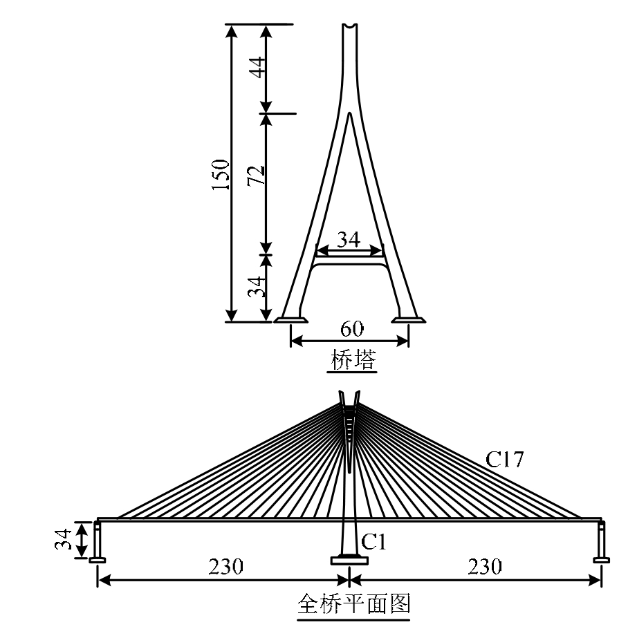 某独塔斜拉桥为采用半漂浮体系的等跨双索面斜拉桥,跨径分布为230 m+230 m。桥塔为倒Y形C50混凝土塔,塔高150 m,塔底两塔柱中心距为 60 m。主梁为全封闭流线型扁平钢箱梁,梁高3.2 m,宽 34 m。过渡墩为门式框架双柱墩,墩高34 m,混凝土材料为C40。主梁在主塔和过渡墩处均设置纵向滑动摩擦支座,主梁横向被抗风支座约束。全桥采用4×17=68根拉索支承主梁,拉索为平行钢丝索,拉索抗拉强度为1670 MPa。图3给出了背景工程的总体布置图;为了便于后续说明,图 3对单侧拉索从塔柱-过渡墩进行了C1~C17编号。表2给出了拉索的设计参数,其中,拉索成桥应力均在450 MPa~550 MPa。