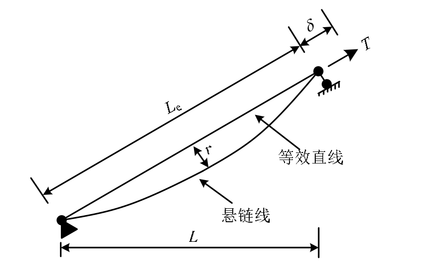 拉索在自重和轴力作用下的曲线为悬链线,如图1所示。为了简便计算,目前常用的方法是用图1中连接拉索两端的等效直线代替拉索实际变形曲线,利用Ernst公式[6]修正拉索的弹性模量来考虑拉索的垂度效应。Ernst公式为: