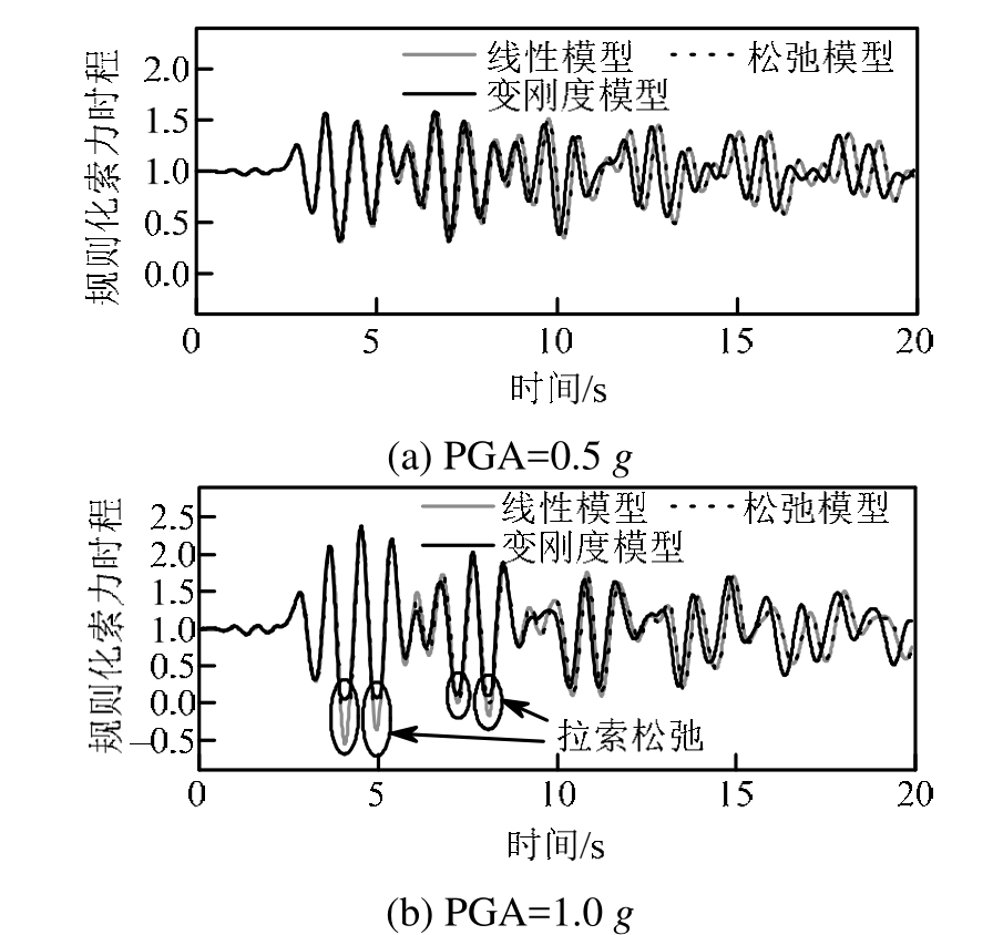从上面分析可知,线性方程忽略了索力变化对拉索轴向刚度的影响,也未考虑强震中可能出现的拉索松弛现象。松弛方程考虑强震中可能出现的拉索松弛现象,但忽略了索力变化对拉索轴向刚度的影响。变刚度方程可同时考虑强震中可能出现的拉索松弛现象和索力变化对拉索轴向刚度的影响。