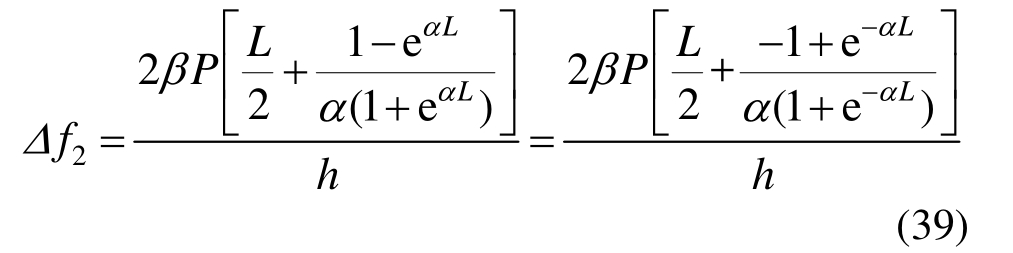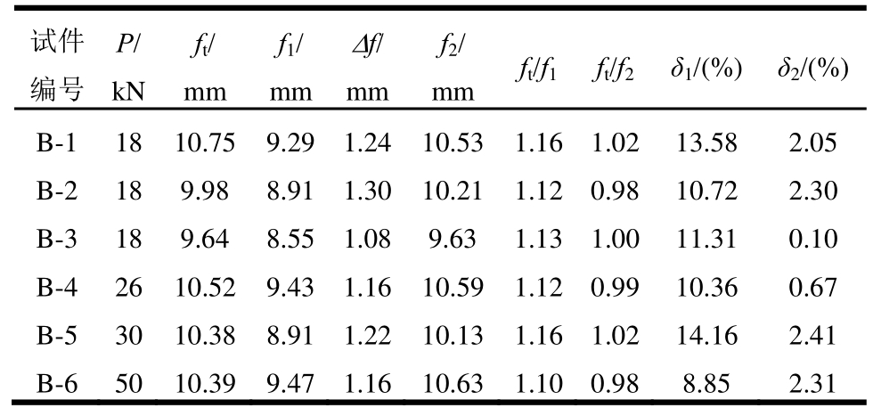 注:ft为跨中挠度试验值,f1为按式(30)所得跨中挠度计算值, Δf为按式(37a)所得跨中附加挠度计算值,f2为考虑附加挠度的跨中挠度计算值,即 f= f+Δf,误差