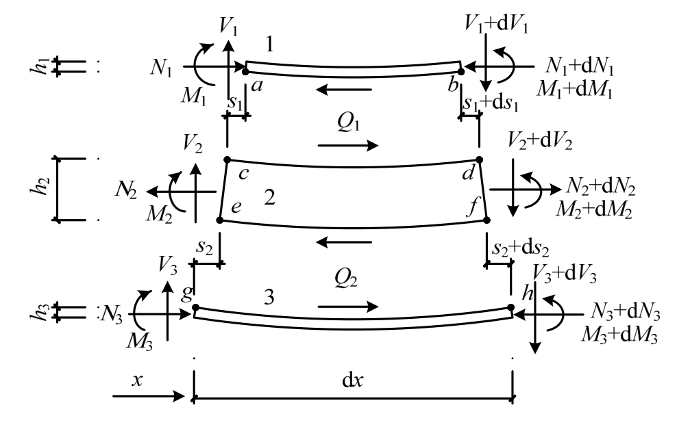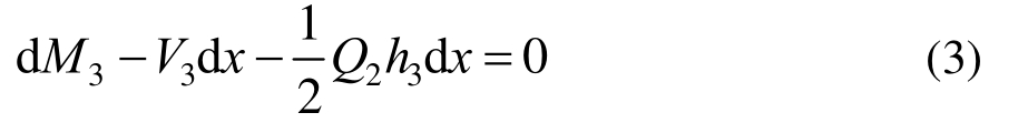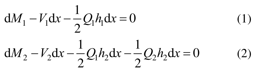 组合梁中截取一微单元体,并将其分解为3个隔离体,上翼缘、腹板以及下翼缘,并依次编号为1、2、3(图2)。根据单元体受力分析得到如下平衡方程: