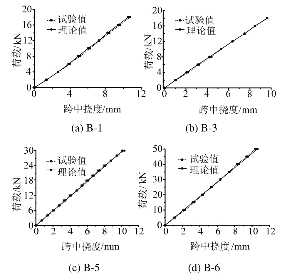 图9为依据该文建立的理论计算方法获得的荷载-跨中挠度关系曲线与试验结果的对比。从图中可看出,荷载-跨中挠度理论曲线与试验曲线吻合良好,说明该文建议的考虑滑移效应的钢-竹组合梁变形分析方法具有较高精度。表2给出了正常使用极限状态下(因分级加载,无法精确对应正常使用极限状态挠度)组合梁的跨中挠度试验值与理论值。表中结果显示,两者间的相对误差δ2均较小,平均误差仅为1.64%,说明考虑滑移效应引起的附加挠度可实现组合梁变形分析结果基本接近实际。