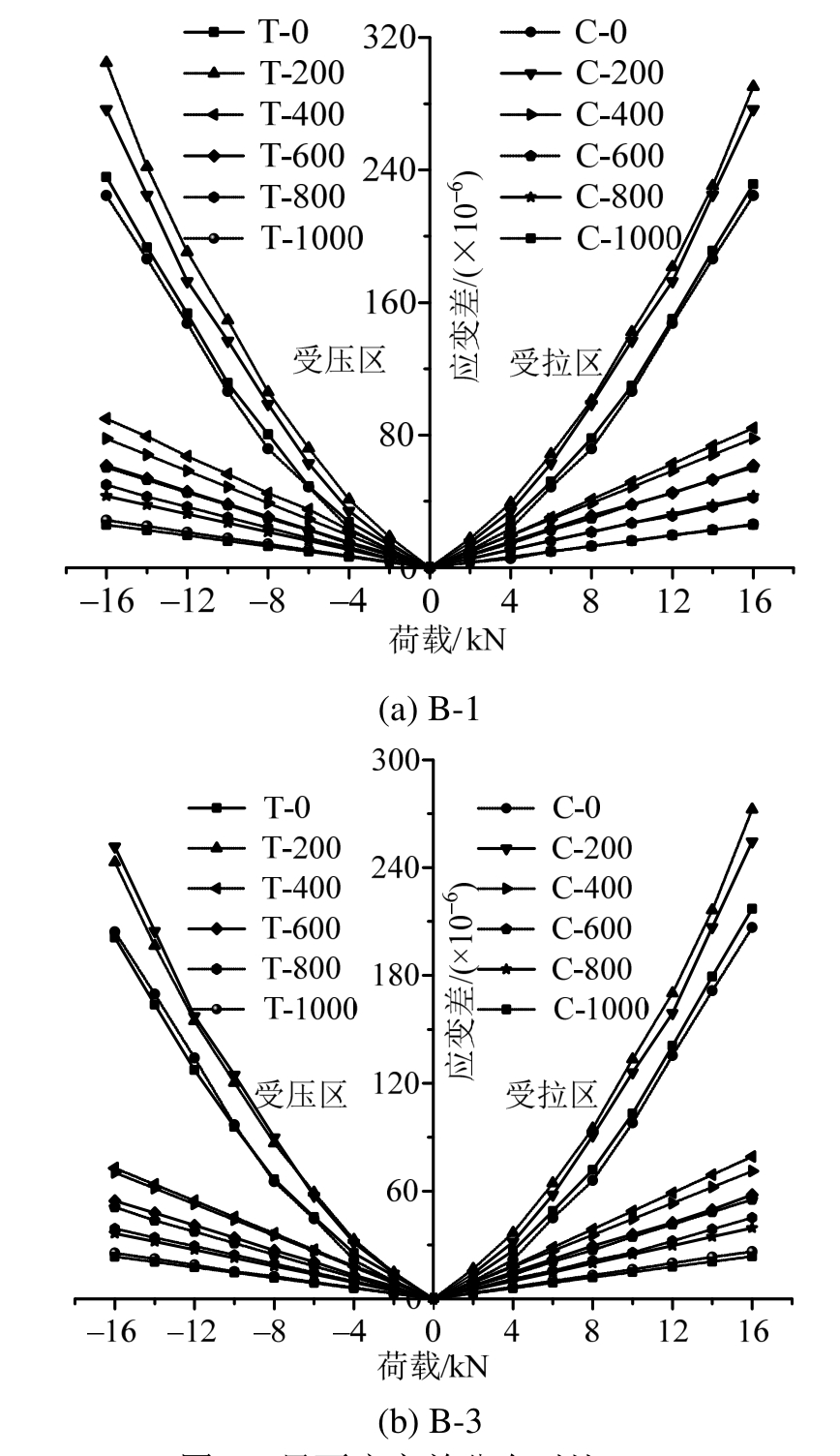 采用式(26)、式(27)和式(46)可得钢-竹界面应变差的理论值与试验值。图7为以B-1和B-3为例绘制的界面应变差试验值与理论值对比情况,图中坐标系左侧和右侧分别为受压区和受拉区在x=0 mm、x=200 mm、x=400 mm、x=600 mm、x=800 mm、x=1000 mm处应变差随荷载变化曲线。图中T表示试验结果,C表示理论分析结果。图7显示,应变差的理论计算值与试验结果之间吻合较好,同一坐标处受压区和受拉区的应变差基本相等,进一步验证了推导式(19)时所用的假设成立。图7结果还表明,在剪弯区段加载点到支座间应变差逐渐变小,相对滑移量斜率为负值;纯弯段从跨中到加载点应变差逐渐变大,相对滑移量斜率为正值。