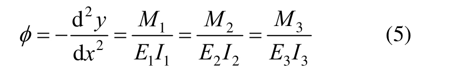 式中:ϕ为曲率;Ei、Ij分别为材料弹性模量和截面惯性矩,下标i,j为隔离体序号(i,j=1, 2, 3);y为截面上任一点到中性轴的距离。由式(4)、式(5)可得: