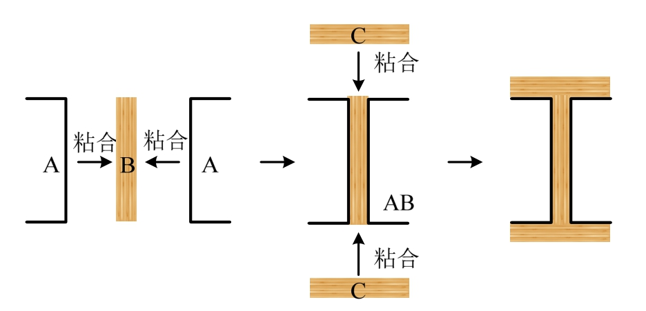 该文所提及的钢-竹组合工字形梁构成方式如下(图 1):以两根背靠背放置的冷弯薄壁槽钢(A)为骨架,其腹板间用高强结构胶粘剂粘结与之等高等长的竹胶板(B)形成钢-竹组合体(AB),在组合体上、下翼缘外侧分别粘结竹胶板(C),从而形成工字形截面的钢-竹组合梁。这种组合方式可保证型钢周边均有竹板支撑,可有效提高薄壁型钢的抗屈曲失稳性能。