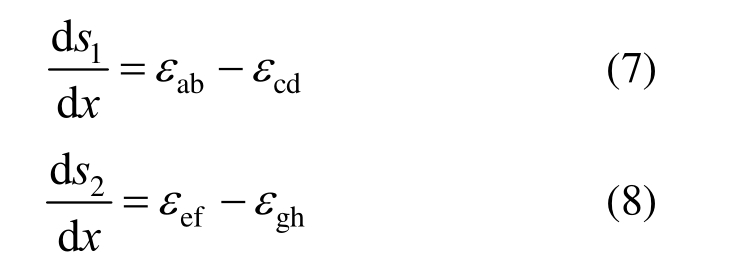 滑移是由于界面两侧物体变形不一致产生,两者变形差值即为界面的滑移量。受压区、受拉区界面滑移与应变差之间可建立如下关系: