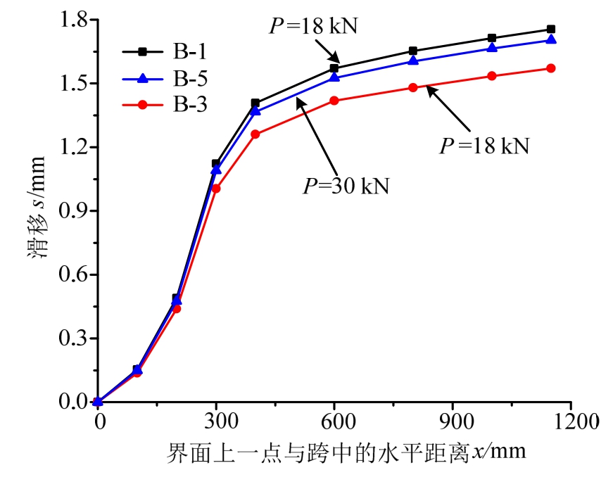 由图8可知,在x=0 mm ~ x=300 mm的纯弯区段,滑移曲线斜率增大,在x=300 mm ~ x=1150 mm的弯剪区段,曲线斜率则逐渐减小,与前述应变差分析结果相一致,界面应变差与滑移之间的微分关系进一步得到验证。正常使用阶段组合梁的弯剪区段滑移较大,且梁端部达到最大值。为了减小界面滑移效应对组合梁受力性能的不利影响,可在梁端及加载点间的弯剪区段布置一定间距的连接件,以提高组合梁的整体工作性能。