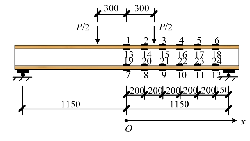 组合梁的制作加工及相关试验在宁波大学结构工程实验室完成。以四轴万能试验机为支座,采用机械千斤顶施加对称集中荷载。试验采用分级加载,其中 B-1~B-5每级荷载为 2 kN,B-6每级荷载为5 kN。组合梁1/2跨度范围内,其上、下翼缘的内、外侧表面按200 mm间距粘贴若干应变片(图 5),以测得型钢与竹板的应变分布及其变化,为钢-竹界面应变差分析提供基础数据。图中还建立了以跨中为原点的单轴坐标系。试件的支座、跨中及集中荷载作用点处布置位移传感器,以测定组合梁在荷载作用下的竖向挠度。