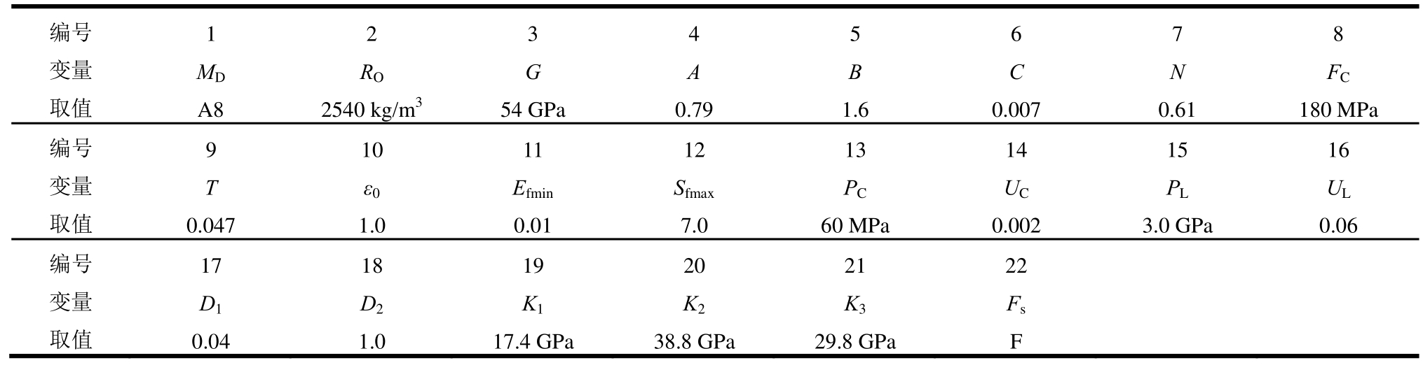 目前对于冲击、爆炸等极限应变率条件下混凝土破坏材料模型使用较多的是 HOLMQUISTJOHNSON-COOK材料模型(简称HJC模型)[21],经过大量研究证明,该模型能较好地反映混凝土材料在爆炸、冲击等极限应力荷载条件下的破坏过程[22]。HJC模型中共有21个参数,这些参数的准确性,是数值模拟可靠性的基础。然而,已有的HJC模型参数都是针对普通混凝土,对于UHPC材料的模型参数还鲜有报道。对于 UHPC材料 HJC模型参数的确定,除了一些实验测量所得数据外,还需要进行大量的试算、反演得到一些影响性的参数。笔者基于霍普金森压杆(SHPB)试验数据LS-DYNA模拟结果比对和拟合的方法,获取了能表征UHPC材料在冲击荷载条件下动态响应的HJC本构模型参数[23],模型具体参数如表5所示。