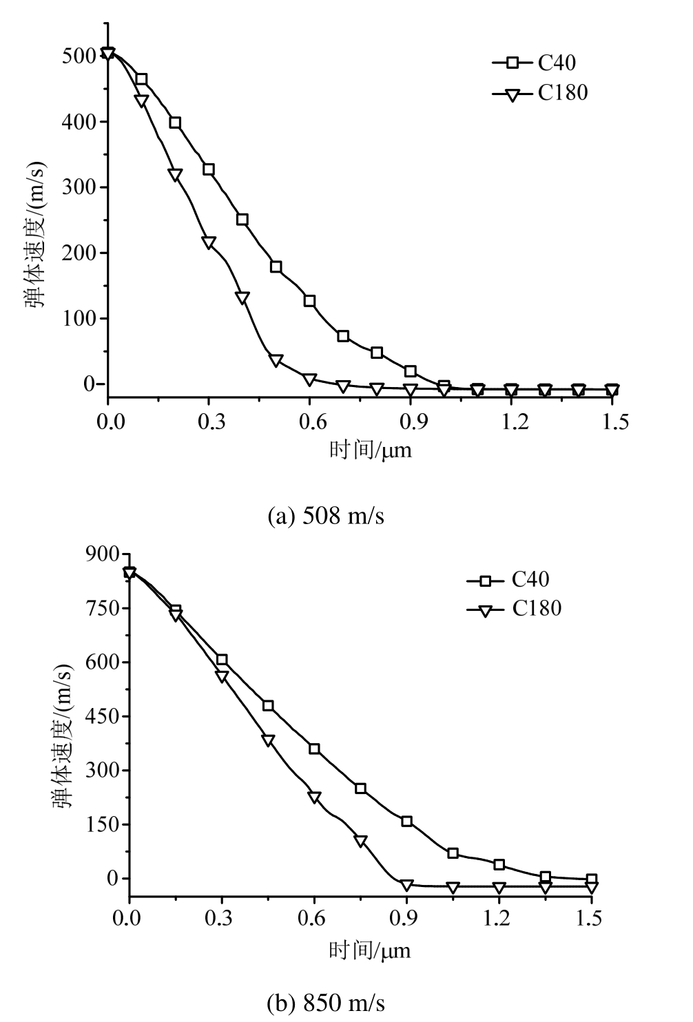 图11(a)与图11(a)是侵彻过程中弹体速度-时间关系曲线。从图中可以看出,曲线在开始阶段很短一段时间内表现为平缓状态,这是由于弹体与靶体刚接触的初始阶段弹体没有完全进入靶体,所受阻力较小,因此速度下降较为缓慢;当弹体完全侵入靶体后,曲线表现为一定斜率的直线,速度呈现为线性衰减,这是由于弹体完全进行靶体后,在侵彻隧道区内受到的阻力较为稳定,速度的衰减也表现得稳定。由于靶体厚度足够,弹体未能将靶体穿透,因此,当弹体侵彻到一定深度时,速度减小为零,达到最大侵彻深度。此外,从图中同样可以看出,无论是在高速还是低速侵彻的条件下,与C40靶体相比,C180靶体都能在较短时间内使弹体从初始速度除到零,表明C180靶体抗侵彻能力比C40优越。
