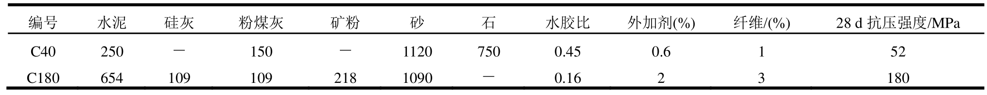 为了比较UHPC与传统混凝土的抗弹体侵彻性能,试验设计了 C40(普通混凝土)和 C180(UHPC)两种不同的配合比。通过合理的搭配不同粒径、不同活性的矿物掺合料,在实现最大密实度的同时发挥各自成分的活性,最终确定UHPC配合比中胶凝材料的比例为水泥∶硅灰∶粉煤灰∶矿渣=50%∶10%∶10%∶30%;水胶比为0.16,胶砂比为1∶1;减水剂掺量为2.3%(占胶凝材料质量的比例),钢纤维掺量为3%。两组配合比参数如表1所示。
