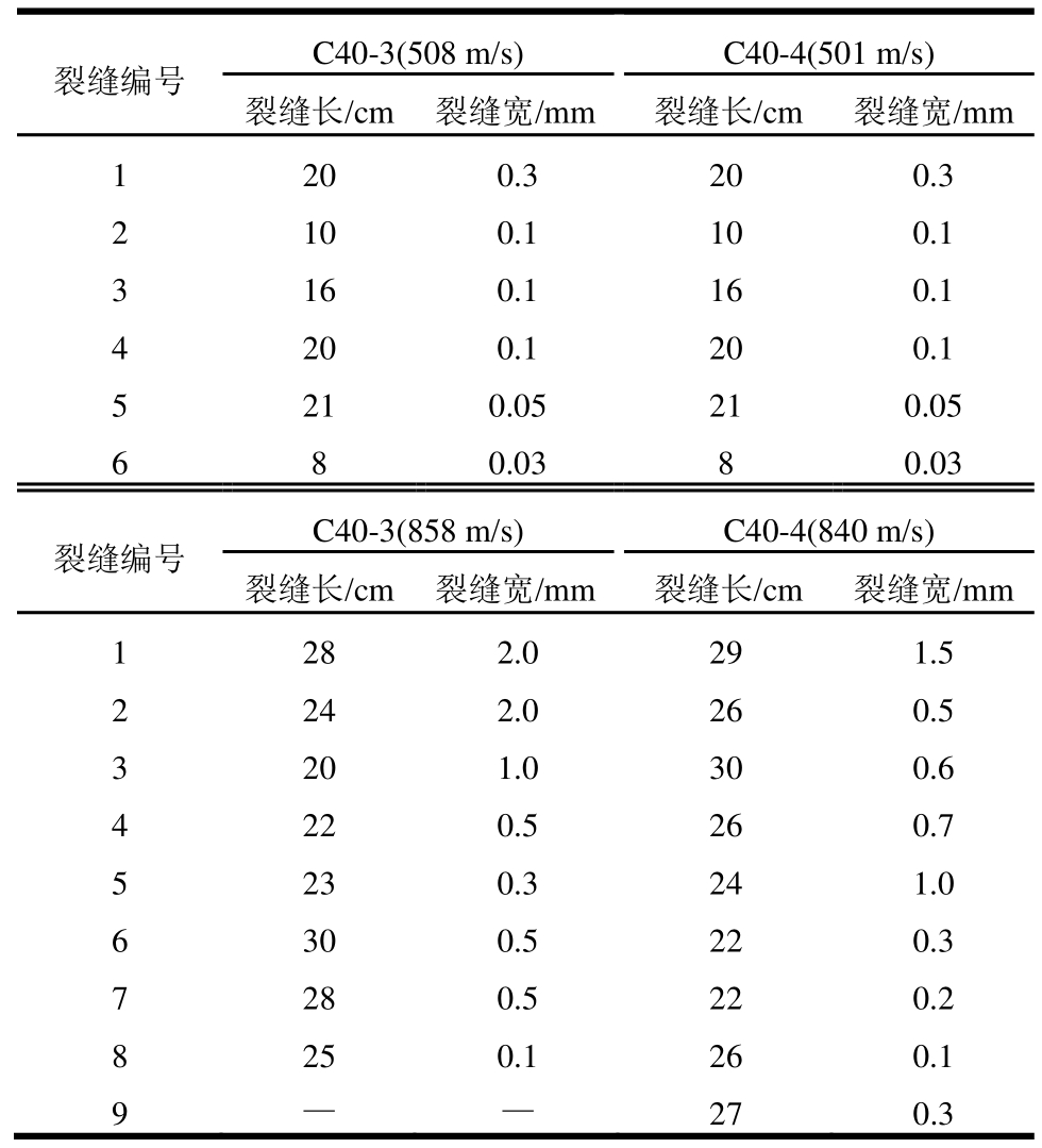 各靶体受弹体侵彻后的状况如图 4和图 5所示,各靶体中裂纹数量及宽度归纳于表3和表4中。从以上图和表中数据可以看出,弹体侵彻速度对裂纹数量及宽度影响明显,速度越大,靶体上裂纹数量越多、宽度越宽。对于C40靶体,850 m/s弹体侵彻后裂纹数量多达 9条,其中最大宽度可达2.0 mm,靶体呈现出最为严重的破坏;对于C180UHPC靶体,在相同条件下的破坏程度降低,其裂纹数量减少为9条,最大宽度约为1 mm,靶体整体性保持完好。从中可以看出,C180靶体具备优越的抗冲击能力。