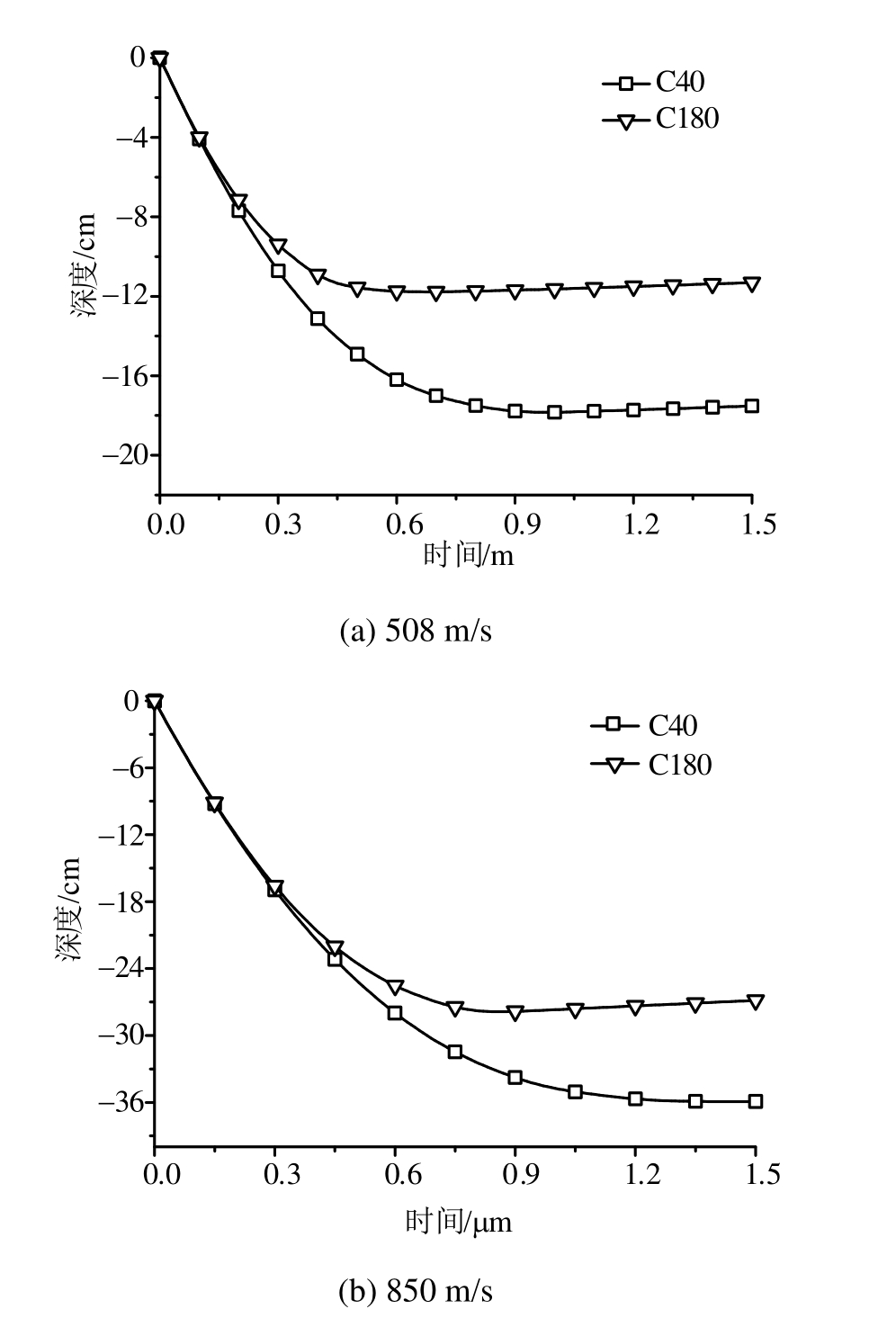 图10(a)与图10(b)分别为508 m/s与850 m/s速度条件下弹体侵彻深度-时间关系曲线。从图中可以看出,低速条件下,C180靶体在0.45 s后基本达到最大侵彻深度,而C40靶体需要0.81 s;对于高速侵彻,C180靶体需要0.75 s弹体达到最大侵彻深度,而C40靶体则需要1.31 s。由此可得,与C40靶体相比,C180靶体由于其致密的内部结构与优越的力学性能,能提供更大的阻力,消耗更多的动能,使弹体在较短时间内达到最大侵彻深度。