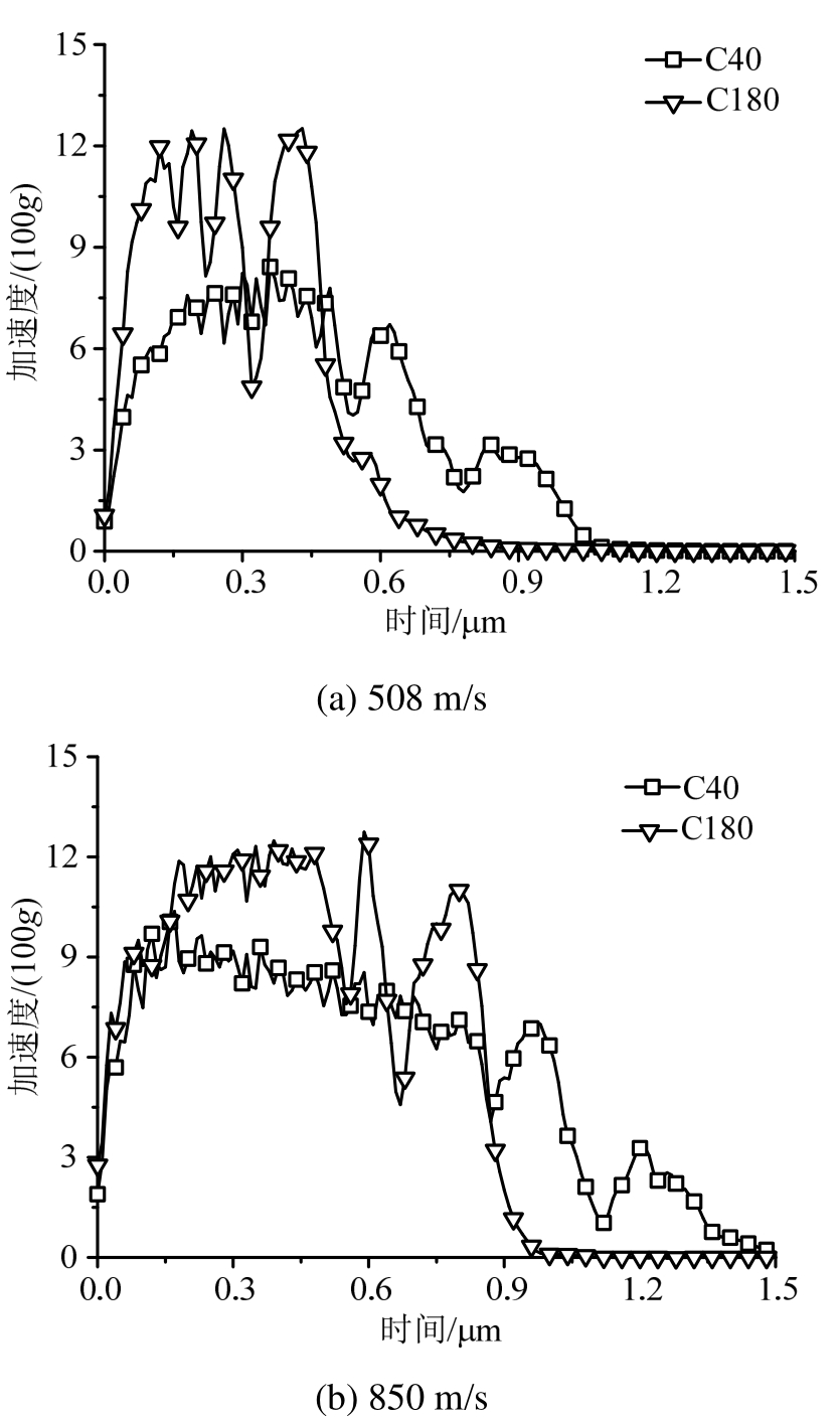 弹体加速度-时间关系曲线如图12(a)与图12(b)所示,即侵彻过程中弹体过载曲线,曲线可以分为三个阶段,与已有研究相一致[24]。在第一阶段,侵彻刚开始,曲线陡然上升,表明加速度急剧增加,这是由于弹体与靶体接触后,阻力突然增加,并且随着弹体的深入,阻力越来越大,该阶段是弹体从开始侵彻到弹体完全进入靶体的过程;第二阶段,当弹体完全进入到靶体后,弹体在侵彻隧道区内运动,弹体与靶体的接触面积一定,因此所受阻力也稳定,虽然有一定的波动,但总体是比较稳定的;第三阶段,随着弹体速度的进一步降低,弹体所受阻力逐渐变小,到最后变为0,到达最深侵彻深度。从图10(a)与图10(b)可以看出,C180靶体的弹体在侵彻过程中的加速度比C40靶体要多很多,在低速条件下,前者最大时约为1200 g,后者最大为750 g,高出近60%;高速条件下也高出近27%。因此,新型超高性能混凝土与混凝土普通相比,能提供优越的抗侵彻能力。