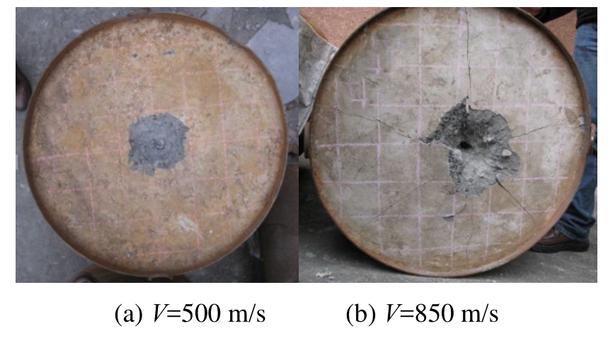 靶体受到弹体的高速撞击、挤压的过程中,靶体材料发生强烈压缩和剪切变形,从而在表面出现裂缝。对于超高性能混凝土来说,由于钢纤维的存在,减小了裂缝端部的应力集中,有效阻止了裂缝的引发与扩展;再者,在裂缝开展过程中会有钢纤维从基体中拔出的现象,超高性能混凝土中钢纤维与基体之间强大的粘结力有效地阻碍了这一过程,并消耗了大量的能量。宏观上表现为靶体的弹坑直径小、裂缝数量少、裂缝宽度小。因此,超高性能混凝土中钢纤维发挥了优秀的高韧、高阻裂性能,能有效地抑制靶体破坏,防止靶体材料的崩飞,维持了靶体的完整性,这对于保护防护工程内部人员的安全意义重大。