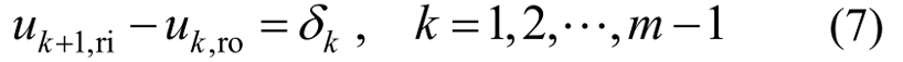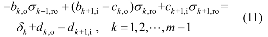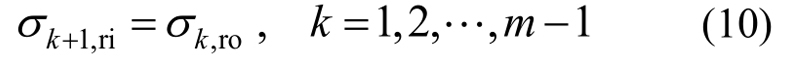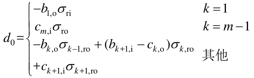 注意σ0,ro≡σri,σm,ro≡σro,σri、σro为已知边界条件。式(11)可整理成线性方程组,从而可以求得式中所有的未知量σk,ro,k=1 ,2,… ,m- 1 。若σk,ro已知,根据式(5)、式(6)并结合式(11)可得m层圆筒的应力分布及径向位移分布。