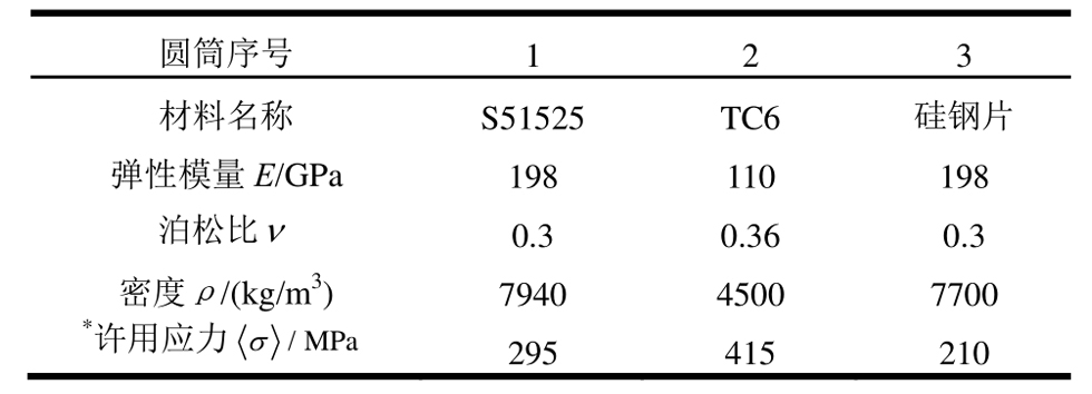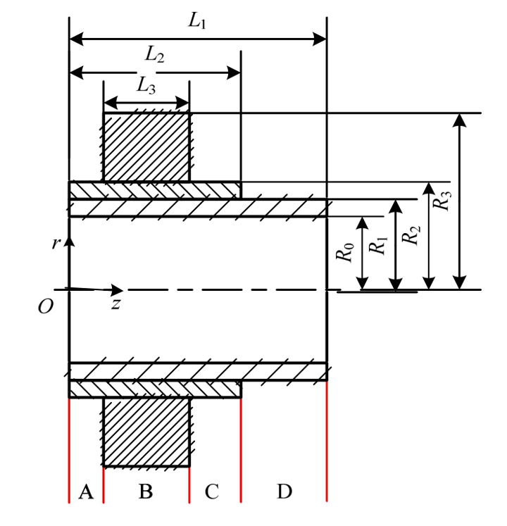 某高速磁悬浮电动机的磁悬浮轴承的转子部分由3层圆筒装配组成,简化模型如图3所示。最外层是由无取向硅钢片叠制而成的磁轴承转子铁芯,最内层为沉淀硬化型不锈钢 S51525制成的主轴(部分),中间层为衬套,选用钛合金TC6材料,3种材料的材料参数和力学性能如表1所示。根据磁悬浮轴承的设计要求,对于转子部分的径向尺寸要求如表2所示,模型轴向长度如表3所示。主轴内壁与定子铁心外壁受外部气压载荷忽略不计,即最内层圆筒的最内侧壁面及最外层圆筒的最外侧壁面的径向应力σri=σro=0 ,以此作为式(11)中应力分析的边界条件;转子转速为50000 r/min。如图3把转子从左至右沿轴向分成A、B、C、D四个区,它们对应的圆筒个数分别为2、3、2、1。根据工程经验,3层转子过盈配合的B区最危险,按B区进行尺寸优化,后面会验证该假设。由表2可以得出径向名义尺寸满足以下不等式: