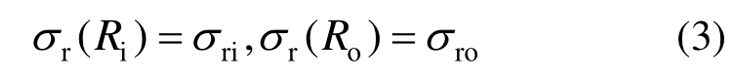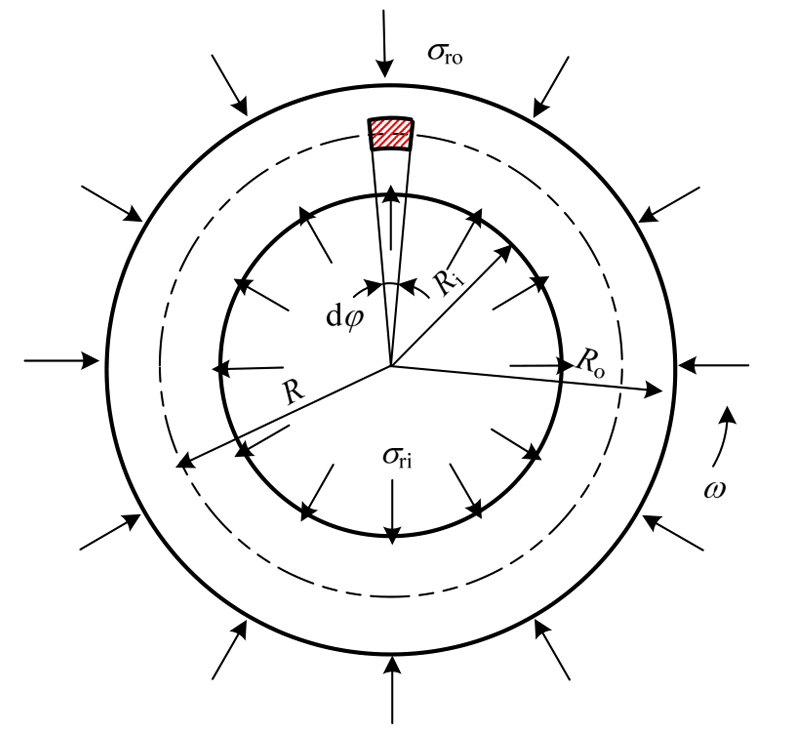如图1所示,按照惯例,假定挤压应力为负,已知静止圆筒的内壁半径、外壁半径分别为Ri、Ro,内、外壁面径向挤压应力分别为σri、σro(图1所示的内、外壁处的径向应力状态为负),给定圆筒边界条件:
