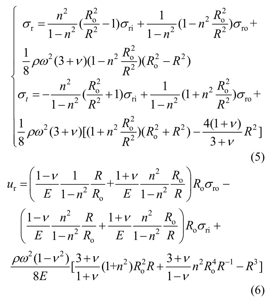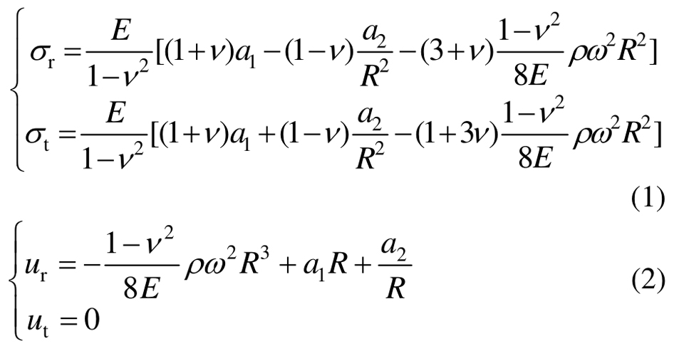 对于旋转轴对称等厚圆盘,关于半径R有如下应力公式及位移公式(不计热应力影响)[3]: