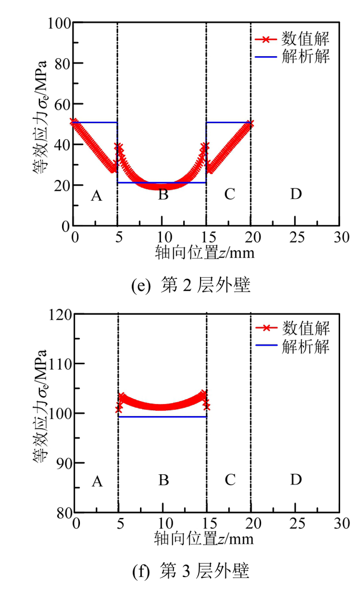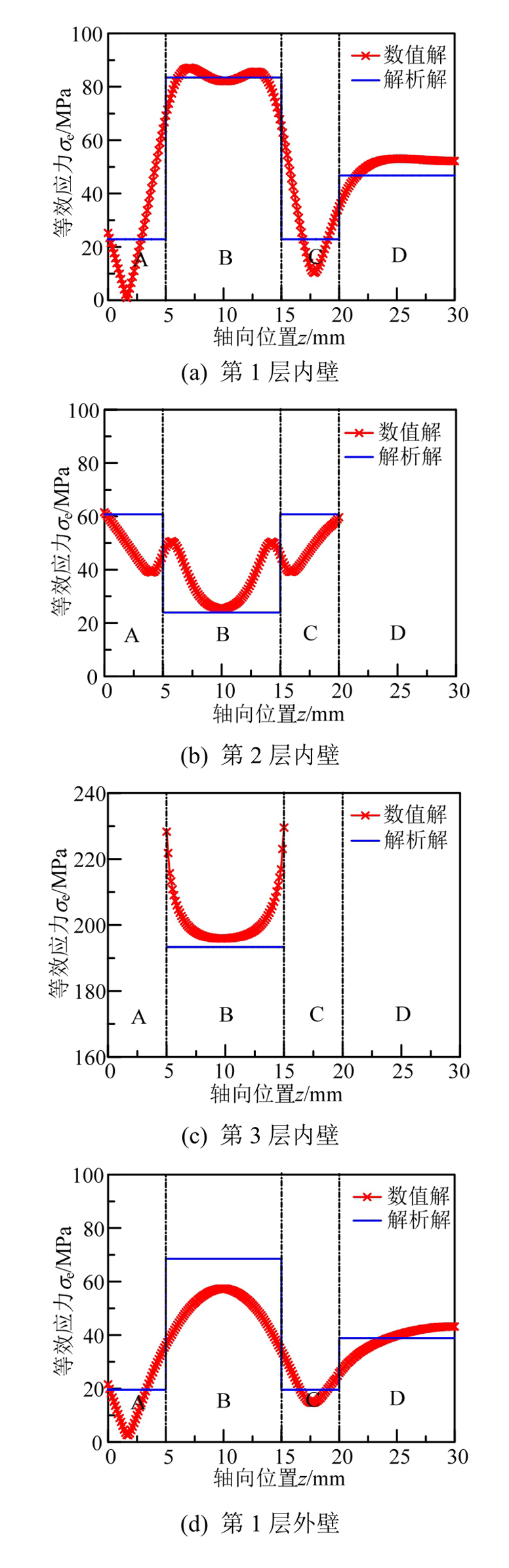 本文对比了解析方法和数值方法下所得的 von Mises等效应力结果,后续通过实验可以进一步验证以上两种方法的准确程度。本文解析计算模型是基于二向应力状态假设推导得出,实际上存在轴向应力,即三向应力状态,后续研究可以进一步考虑多层圆筒过盈配合对轴向应力的影响、改进过盈配合的边缘效应引起的应力集中问题。