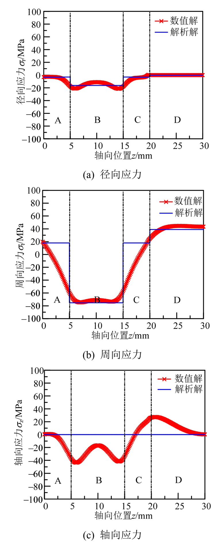 有限元方法和解析法所得的各个环面的 von Mises等效应力沿轴向分布如图8所示。可以看出,由于应力边界效应的存在以及在解析解中二向应力假设,采用解析法和有限元法所得的等效应力结果存在一定的偏差,各个区域位置的数值解等效应力与相应区域的解析解的最大相对偏差如表 9所示。图8(a)与图8(d)中数值解与解析解趋势符合地较好,在z=5 mm、15 mm、20 mm附近的应力变化剧烈,这是由于在这些位置存在应力边界,但在数值解中的应力仍然可以认为是连续分布的。在第 1层圆筒内壁的B区的等效应力预测得较好,但是第1层圆筒外壁则是解析值预测过高,这主要是由于实际z向应力不为0,而解析解采用二向应力假设,即z向应力为0。图9为第1层圆筒外壁采用解析方法与有限元方法所得的径向、周向与轴向应力在z轴方向上的分布。由图9可知,除了上文所述的边界效应,两种方法所得的径向应力和周向应力能较好地吻合,从而验证了第1层圆筒外壁B区等效应力偏差较大的原因。图8(b)和图8(e)中显示第 2层圆筒内壁和外壁的等效应力基本呈对称分布,这是由于在轴向方向上,第3层圆筒基本处于第2层圆筒的中部。应力分布仍然有明显的边界效应,但是解析方法很好地预测了应力范围,仅在B区有少量偏差。如图8(c)与图8(f)所示,解析方法所得等效应力都低于有限元方法的预测值,尤其在第3层圆筒内壁的两端出现等效应力明显升高,而且此处的等效应力为所有位置的最高值,这是由于解析方法的二向应力假设无法考虑端部的应力集中效应,相应的数值解比解析解高出18.72%,这表明采用解析预测方法可能对转子的实际等效应力估计不足,若按照解析方法估计,需要在原有的基础上安全系数提高1.2倍以上。这样,按照有限元方法的预测值,转子最外层圆筒的实际安全裕度为0.915,实际安全系数为1.83。在要求不高且估算等效应力较为准确的情况下,可以基本接受该安全系数。否则,需要重新设计结构(改变已知条件或约束条件)或者外层选用强度更高的材料,设计分析方法类似,这里不再展开。