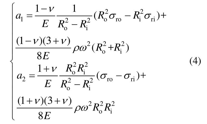 式中:rσ、tσ、ur、ut分别为旋转等厚圆筒在半径R处的径向应力、切向应力、径向位移及周向位移;E、ν、ρ分别为圆筒材料的弹性模量、泊松比以及质量密度;ω为旋转圆筒材料的角速度。