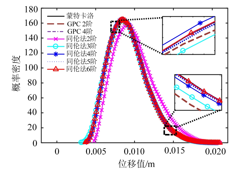 Fig.2 PDFs of the displacement at the end of the cantilever beam