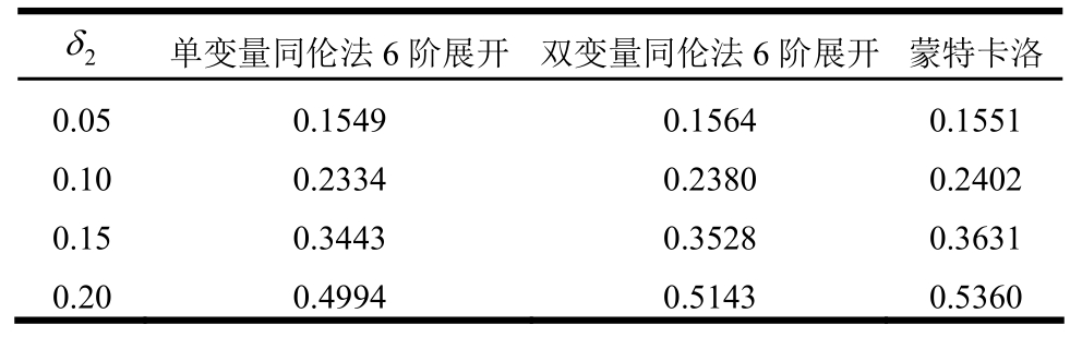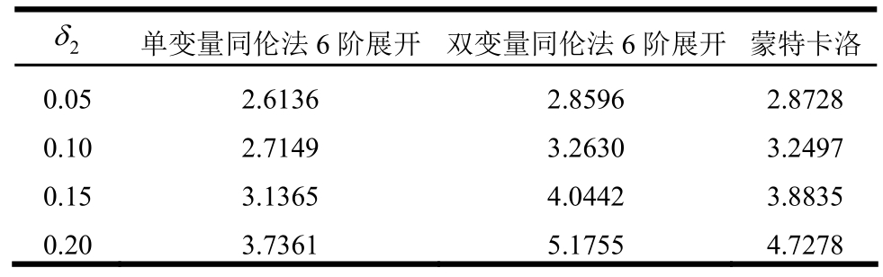 2δ 单变量同伦法6阶展开 双变量同伦法6阶展开蒙特卡洛0.05 0.1549 0.1564 0.1551 0.10 0.2334 0.2380 0.2402 0.15 0.3443 0.3528 0.3631 0.20 0.4994 0.5143 0.5360