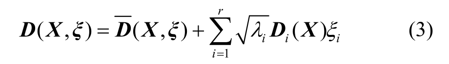 假设结构的弹性模量为一连续随机场,目前常见的离散随机场的方法包括中心点法、形状函数法、最优线性估计、权重积分法和Karhunen-Loéve展开法等,对于这些方法的具体探讨和比较可参考文献[19]。若选择用Karhunen-Loéve展开来离散此弹性模量随机场,具体表示方法如下:设含r个随机变量ξ={ξ1,ξ2,…,ξr }的弹性模量可表示为E(X,ξ),其中X代表空间坐标。将弹性模量的自协方差函数记作C(x1,x2),那么利用Karhunen-Loéve展开离散后的弹性模量随机场可表示为: