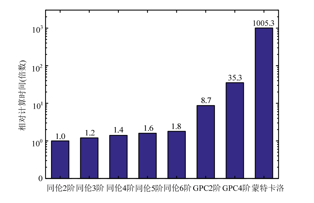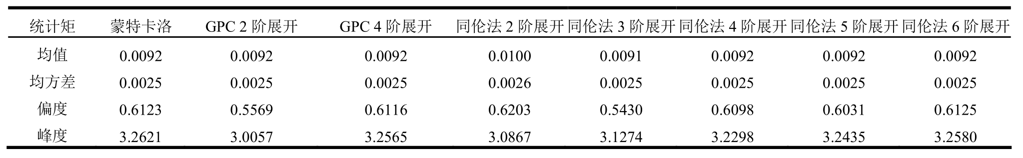 统计矩 蒙特卡洛 GPC 2阶展开 GPC 4阶展开 同伦法2阶展开同伦法3阶展开同伦法4阶展开 同伦法5阶展开 同伦法6阶展开均值 0.0092 0.0092 0.0092 0.0100 0.0091 0.0092 0.0092 0.0092均方差 0.0025 0.0025 0.0025 0.0026 0.0025 0.0025 0.0025 0.0025偏度 0.6123 0.5569 0.6116 0.6203 0.5430 0.6098 0.6031 0.6125峰度 3.2621 3.0057 3.2565 3.0867 3.1274 3.2298 3.2435 3.2580