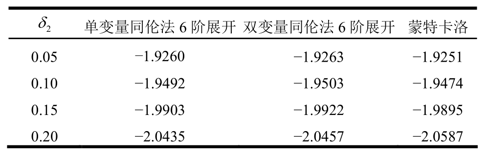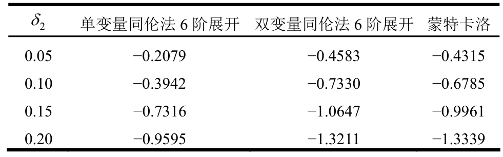 2δ 单变量同伦法6阶展开 双变量同伦法6阶展开蒙特卡洛0.05 -0.2079 -0.4583 -0.4315 0.10 -0.3942 -0.7330 -0.6785 0.15 -0.7316 -1.0647 -0.9961 0.20 -0.9595 -1.3211 -1.3339