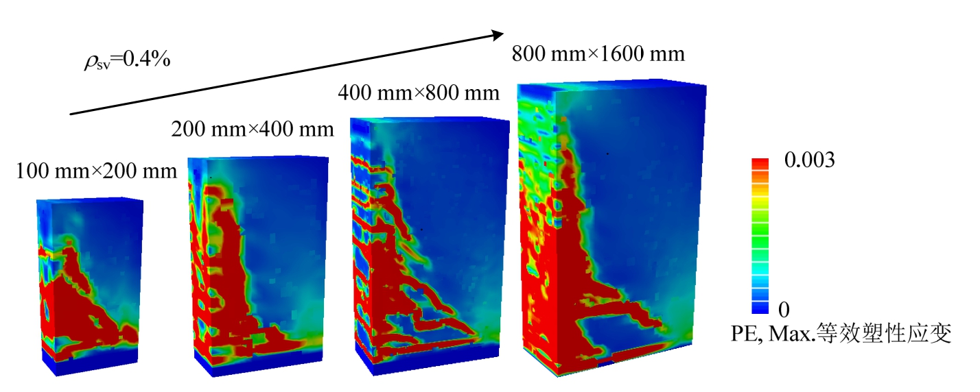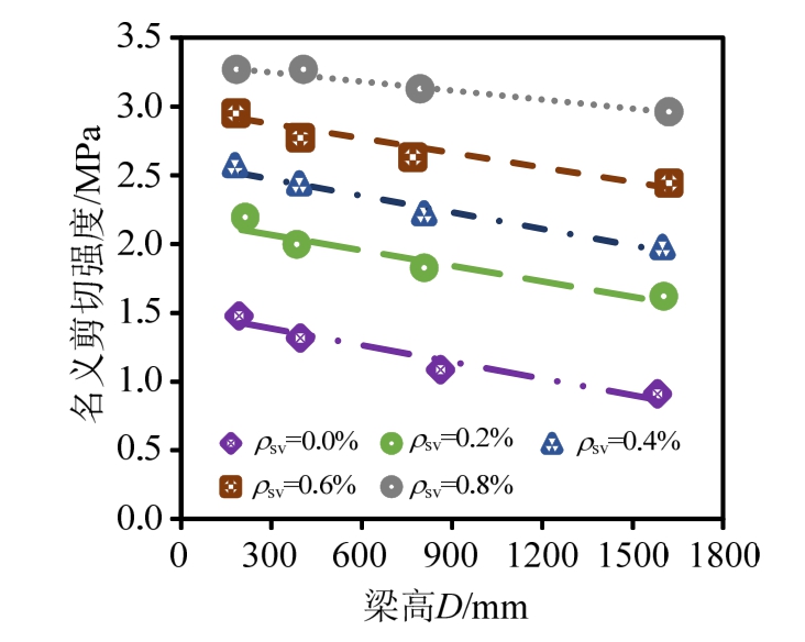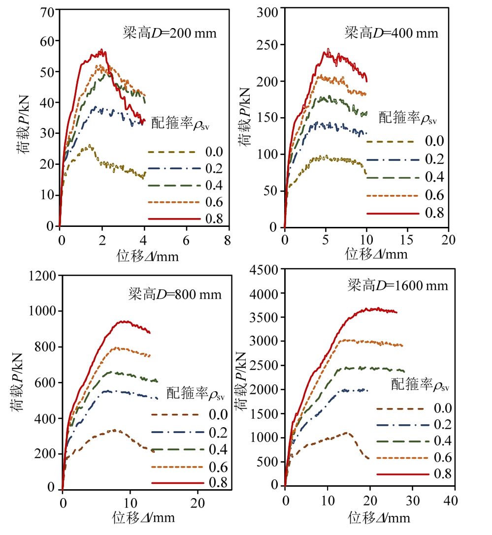 如前文所述,箍筋可以限制裂缝开展,进而改善混凝土梁剪切破坏时的延性,削弱抗剪强度尺寸效应。下面讨论配箍率对梁抗剪强度尺寸效应的具体影响。
