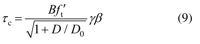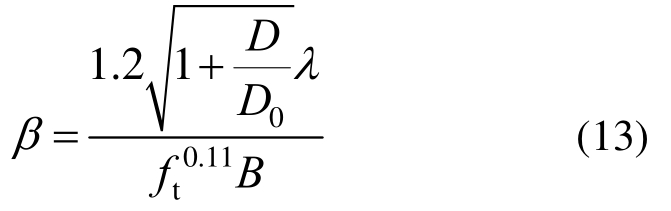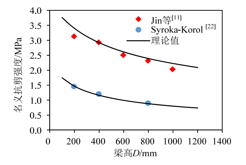 式中:σNu为混凝土构件的名义抗剪强度;B和D0为经验系数;D为混凝土构件的特征尺寸(这里即为梁截面高度);