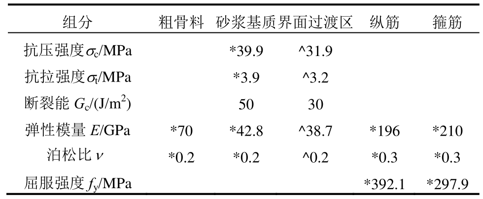 混凝土3种细观组分及钢筋力学参数如表1所示,包括拉伸/压缩强度,断裂能等力学参数。其中:“*”所示的力学参数为实测数据;“^”所示的界面力学参数是通过反复试算确定的界面力学参数[21]。具体的做法是将实际的砂浆基质的力学参数进行不同程度的折减(如70%~85%),作为界面力学参数的试算值,然后对混凝土立方体试块(边长为150 mm)进行反复的压缩破坏数值模拟试验,选取最接近实测混凝土抗压强度的1组数据作为界面力学参数。