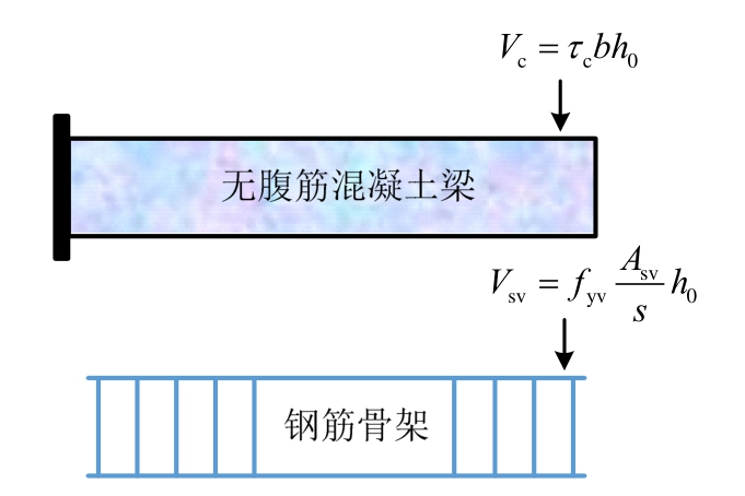 钢筋混凝土梁的抗剪承载力V主要由两部分组成:1) 箍筋直接受剪而承担的剪力Vsv;2) 无腹筋混凝土梁承受的剪力Vc。因此,梁的抗剪承载力V为: