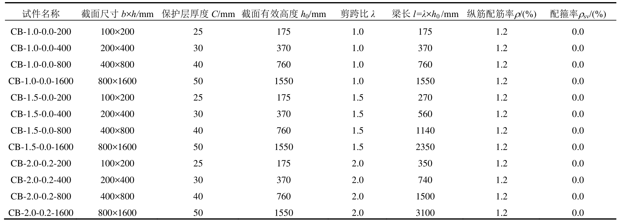 试件名称 截面尺寸b×h/mm 保护层厚度C/mm 截面有效高度h0/mm剪跨比λ 梁长l=λ×h0 /mm纵筋配筋率ρ/(%) 配箍率ρsv/(%)CB-1.0-0.0-200 100×200 25 175 1.0 175 1.2 0.0 CB-1.0-0.0-400 200×400 30 370 1.0 370 1.2 0.0 CB-1.0-0.0-800 400×800 40 760 1.0 760 1.2 0.0 CB-1.0-0.0-1600 800×1600 50 1550 1.0 1550 1.2 0.0 CB-1.5-0.0-200 100×200 25 175 1.5 270 1.2 0.0 CB-1.5-0.0-400 200×400 30 370 1.5 560 1.2 0.0 CB-1.5-0.0-800 400×800 40 760 1.5 1140 1.2 0.0 CB-1.5-0.0-1600 800×1600 50 1550 1.5 2350 1.2 0.0 CB-2.0-0.2-200 100×200 25 175 2.0 350 1.2 0.0 CB-2.0-0.2-400 200×400 30 370 2.0 740 1.2 0.0 CB-2.0-0.2-800 400×800 40 760 2.0 1500 1.2 0.0 CB-2.0-0.2-1600 800×1600 50 1550 2.0 3100 1.2 0.0