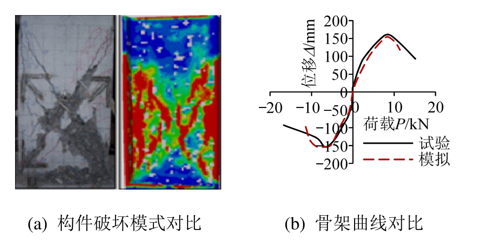 为验证上述细观尺度数值模拟方法的合理性与有效性,结合试验开展了悬臂梁剪切破坏数值模拟。图2(a)为试验结果与模拟结果破坏模式对比图。在低周往复荷载作用下,试验梁最终产生X形裂缝,梁的两侧由于受拉而产生了细微裂纹,但破坏时的主裂缝从固定端一侧斜向贯通至加载点附近,主裂缝处的混凝土由于受拉严重并达到极限拉应变而部分脱落,底部混凝土受压并达到极限压应变而脱落,悬臂梁最终破坏。图2(b)为骨架曲线对比图。模拟得到的骨架曲线大致形状及荷载峰值均与试验结果吻合较好,只有反向加载段的曲线走向与试验结果有部分偏差。