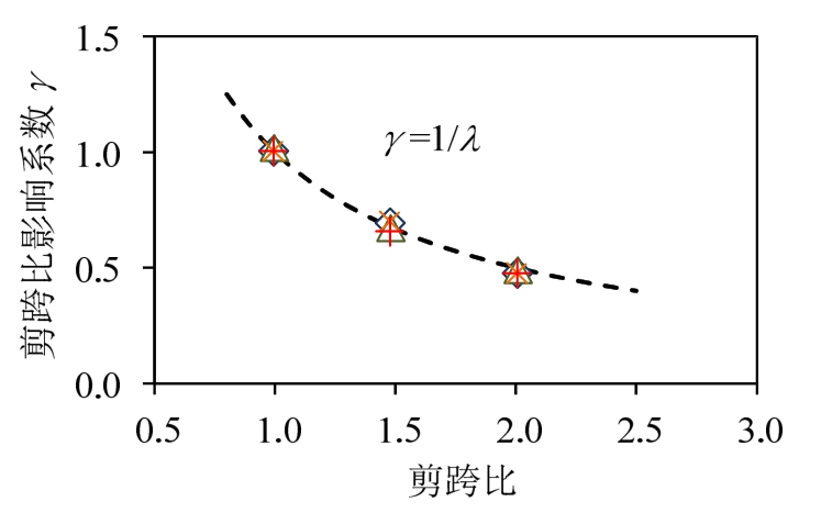 根据第2节的结论,这里首先考虑剪跨比的影响。随着剪跨比增大,梁抗剪强度呈现出减小趋势,对此可用剪跨比对抗剪强度的影响系数γ来表征。