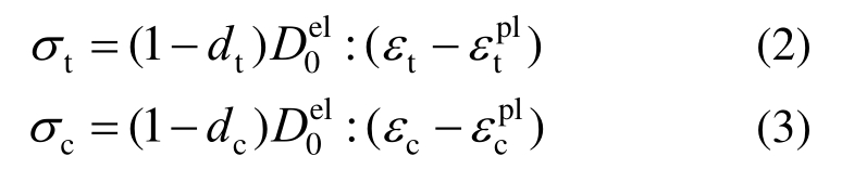 为初始弹性矩阵;d表示损伤变量;εpl表示塑性应变张量。其中,弹性刚度的退化具有两个损伤变量:拉伸损伤因子dt和压缩损伤因子dc,拉伸和压缩下的应力-应变关系分别为:
