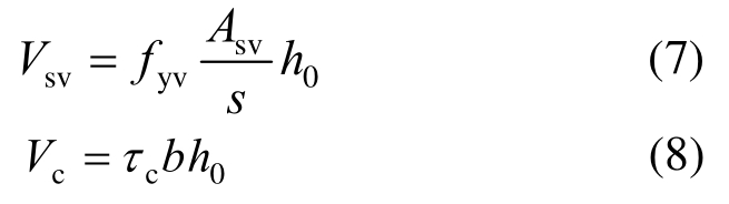 式中:fyv为箍筋抗拉强度设计值;Asv为配置在同一截面内箍筋各肢的全部截面面积;s为沿构件长度方向的箍筋间距;h0为截面有效高度;τc为无腹筋混凝土梁名义抗剪强度;b为梁截面宽度。