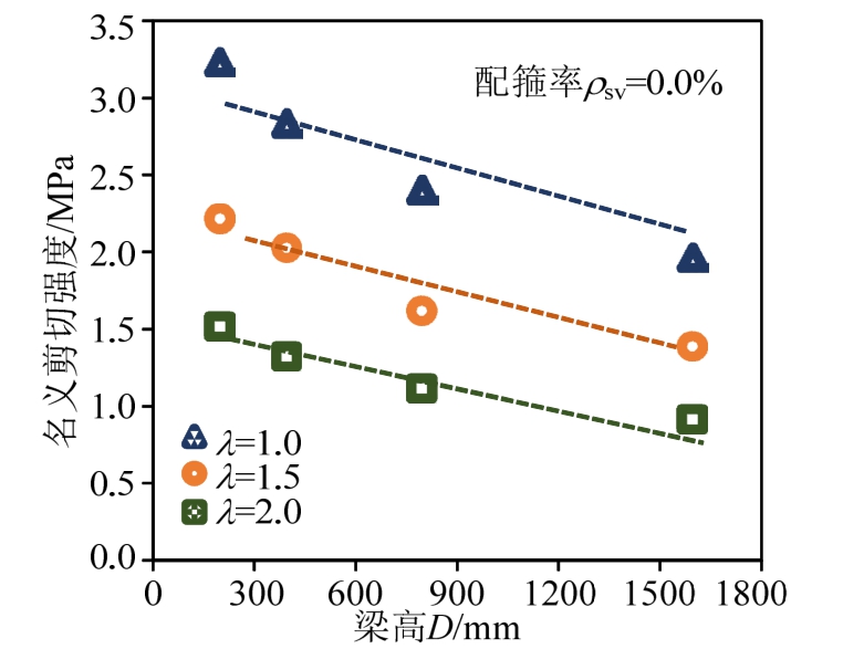 图6为3种剪跨比下的无腹筋悬臂梁名义抗剪强度随尺寸的变化趋势。相同尺寸的悬臂梁,剪跨比越小,名义抗剪强度越大。剪跨比最小(λ=1.0)的梁名义抗剪强度比剪跨比最大(λ=2.0)时提高近50%,说明剪跨比对抗剪强度值有着极为重要的影响。对于相同剪跨比的梁,名义抗剪强度随尺寸的增大而明显降低,梁高1600 mm比200 mm的梁名义抗剪强度下降近40%,表现出了明显的尺寸效应现象。但由于图6中3条趋势线基本平行,即不同剪跨比下,悬臂梁的名义抗剪强度随尺寸下降的趋势和速度相同,说明剪跨比对尺寸效应的影响较小。