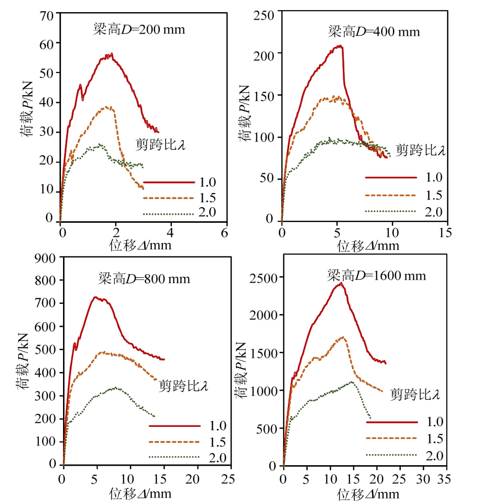 图5为相同尺寸,不同剪跨比的无腹筋悬臂梁荷载-位移(P-Δ)曲线。加载初期,曲线接近直线,梁刚度基本保持恒定,此时已经有细微裂缝出现;随后曲线出现一定程度的波动,刚度不稳定退化,此时裂缝开始斜向发展;继续加载,曲线仍处在上升阶段,但随着裂缝斜向扩展延伸,刚度退化明显;最终曲线达到峰值后陡降,梁刚度急剧退化,发生明显的脆性剪切破坏,完全失去承载能力。如图5所示,随着剪跨比的增大,梁抗剪承载力明显降低。小剪跨比(λ=1.0)时,梁的P-Δ曲线在峰值点后下降更为剧烈,表明斜压破坏相比于剪压破坏具有更强的脆性特征。