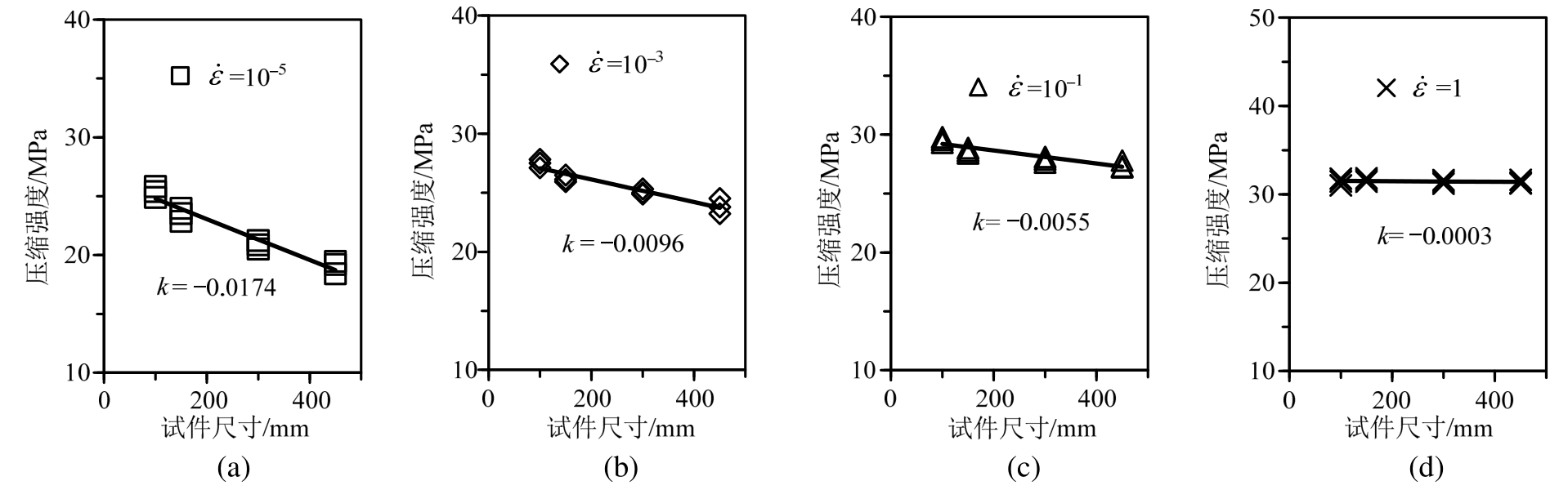时,强度退化斜率k(通过线性拟合得到,表征混凝土试件压缩强度随截面尺寸减小的速度快慢)最小,k=0.0003,说明拟合直线基本处于水平状态,即轻骨料混凝土动态压缩强度在此应变率下随截面尺寸几乎没有变化,尺寸效应被抑制。当应变率低于临界应变率