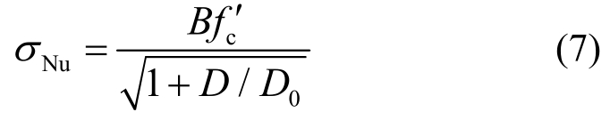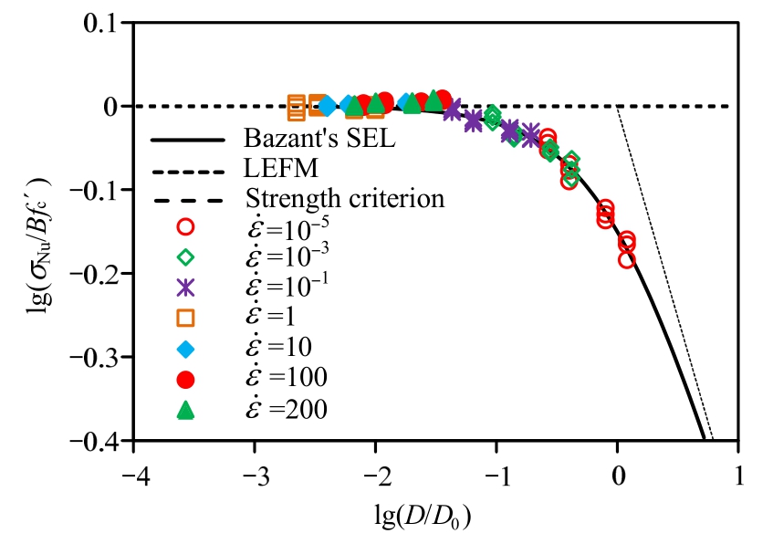 目前,经典的混凝土材料静态尺寸效应理论主要有断裂力学尺寸效应理论、统计尺寸效应理论、多重分形尺寸效应理论、边界尺寸效应理论及全局(统一)尺寸效应理论。其中,Bažant基于断裂力学理论建立的断裂力学尺寸效应律[32]能够很好描述混凝土材料的失效行为,较好地反映混凝土材料破坏尺寸效应现象,因此被越来越多的学者所接受和使用,其表达式为: