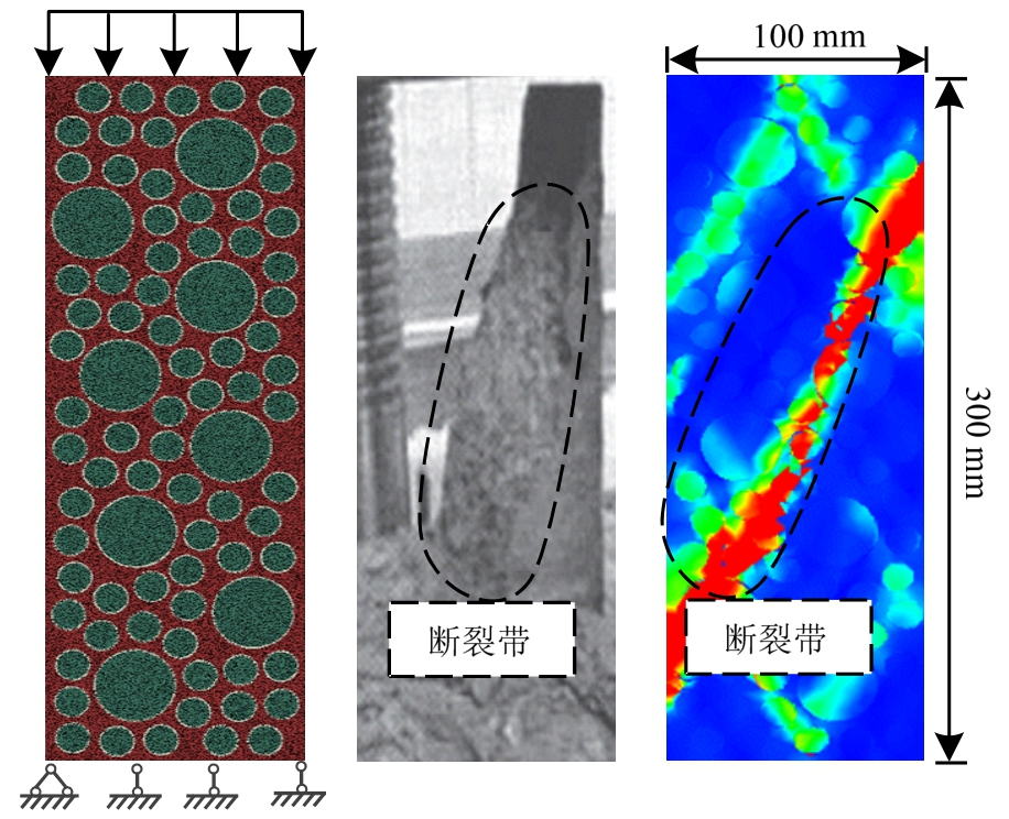 另外,本文对黄锦波[29]开展的轻骨料混凝土轴心抗压试验进行模拟。图3为二维数值模型及模拟破坏结果同黄锦波[29]试验的对比情况,发现模拟与试验破坏模式相同,即裂缝贯穿轻骨料颗粒,沿试件斜向贯通,形成斜向断裂带。